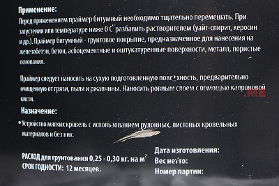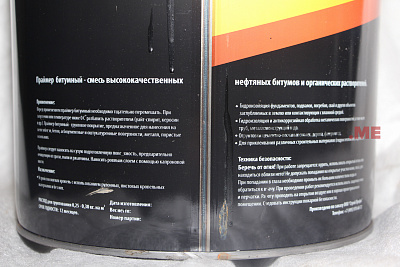 Праймер битумный отличается высокой теплостойкостью, проникающей и смачивающей способностью, малым временем высыхания, отсутствием остаточной липкости. Он обеспечивает качественное приклеивание гидроизоляционных материалов к пористым, шероховатым и пыльным поверхностям с помощью глубокого проникающего быстросохнущего средства.