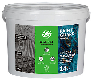 Краска фасадная «ОБЕРЕГ PaintGuard» - латексная водно-дисперсионная краска для внутренних и наружных работ. Предназначена для высококачественной окраски фасадов, стен и потолков внутри сухих помещений, помещений с повышенной влажностью и высокой проходимостью (кухни, ванные, коридоры, холлы, офисы, торговые залы и др.), по бетонным, оштукатуренным, гипсокартонным, кирпичным, деревянным поверхностям.