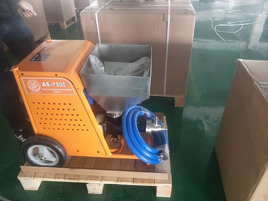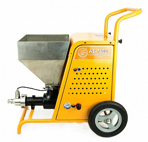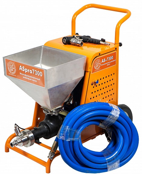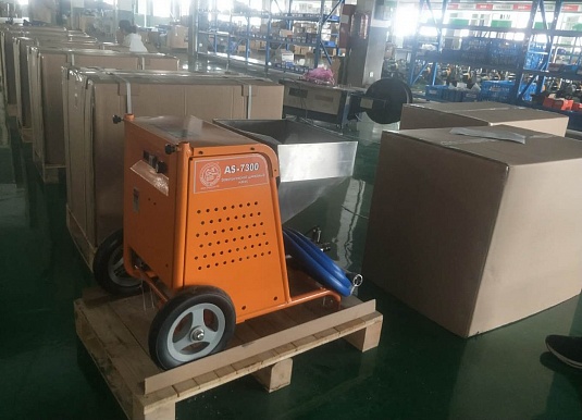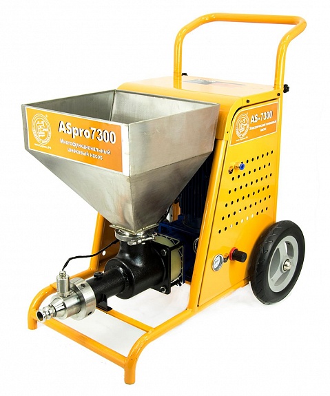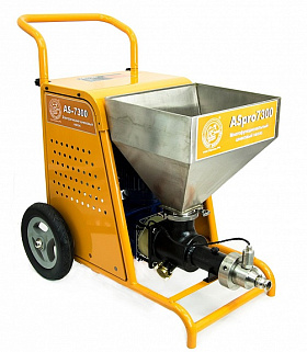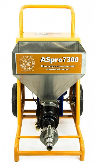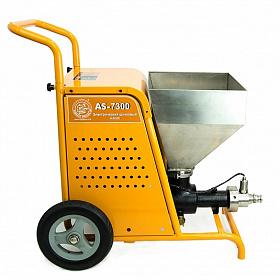 AS-7300 представляют собой установки, состоящие из асинхронного электродвигателя с регулировкой частоты и запуска частотным преобразователем; редуктора, передающего крутящий момент на шнековый насос, бункера для материала из нержавеющей стали; напорного шланга для материала; пневматического пистолета-распылителя с возможностью формирования плоского факела; воздушного шланга, для подачи сжатого воздуха к пистолету.