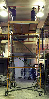 С рабочей площадкой 2х2 м и нагрузкой на настил до 250 кгс/м2. Она предназначена для проведения строительно-монтажных, отделочных и ремонтных работ как внутри помещения, так и снаружи, на высоте до 21 метра.