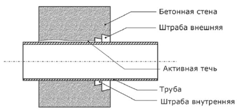 Для гидроизоляции стыков труб и иных металлических элементов с бетонной, каменной, кирпичной поверхностью при наличии активных течей, штраборезом (отбойным молотком или иным способом) на поверхностях в местах примыкания труб нарезать две штрабы: внешнюю глубиной 80 -100 мм, шириной 70 – 80 мм и внутреннюю глубиной 40 – 50 мм, шириной 20 – 25 мм. Внутренняя (меньшая) штраба предназначена для остановки активной течи, внешняя - для гидроизоляции стыка. Ширина каждой из штраб внутри должна быть на 2 – 4 мм больше, чем снаружи (штраба в виде ласточкина хвоста расширением внутрь). Штрабу нарезают по кругу вплотную к трубе (иному металлическому элементу).