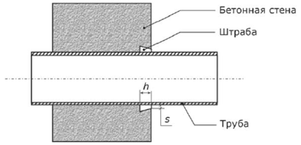 Для гидроизоляции стыков труб и иных металлических элементов с бетонной, каменной, кирпичной поверхностью, при отсутствии активных течей, штраборезом (отбойным молотком или иным способом) на поверхности, в местах примыкания труб и иных металлических элементов нарезать штрабы глубиной 40-50 мм., шириной 20-30 мм. Ширина штрабы внутри должна быть на 2-4 мм. больше, чем снаружи (штраба в виде «ласточкина хвоста» расширением внутрь). Штрабу нарезают по кругу вплотную к трубе (иному металлическому элементу).