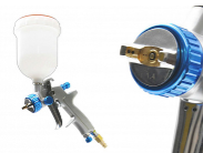 Краскопульты низкого давления работают с высоким объемом воздуха и низким давлением воздуха (до 0,07 МПа). Материал как при методе FineSpray при выходе через сопло полностью распыляется воздухом. Небольшое давление материала при высокм объеме воздуха обеспечивает несколько большие капли материала и тем самым меньше распыляемого тумана.